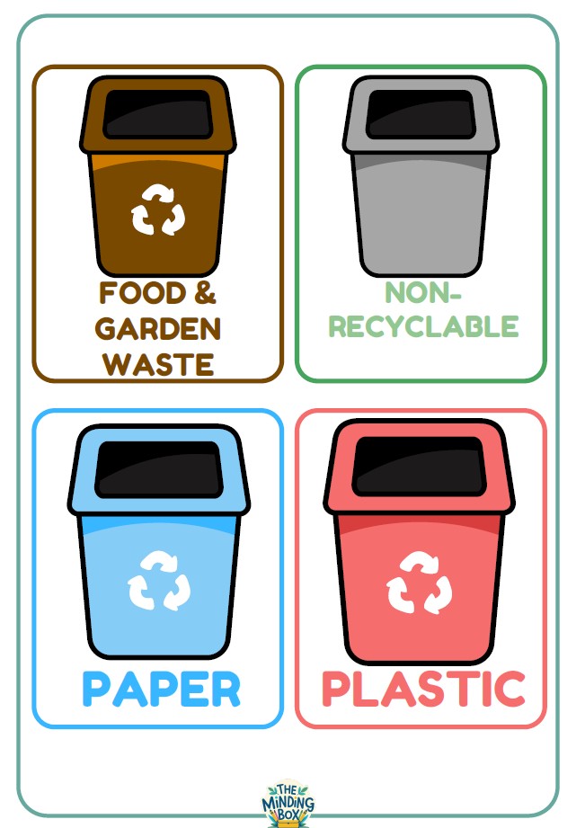 Here Are some ideas how you could use this printable.   🎨 1. Sorting Game (Hands-on learning) Put the different recycling bins in separate areas